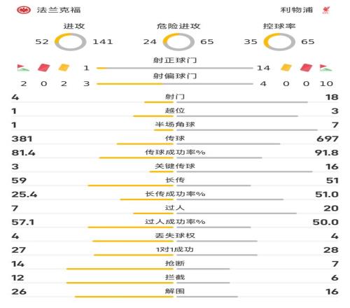 因为法兰克福在全场比赛里,处于被动挨打的境地,这也令球队在防守数据方面占优,在抢断(14-7)、拦截(12-6)和解围(26-16)等数据方面,皆全面优于利物浦。