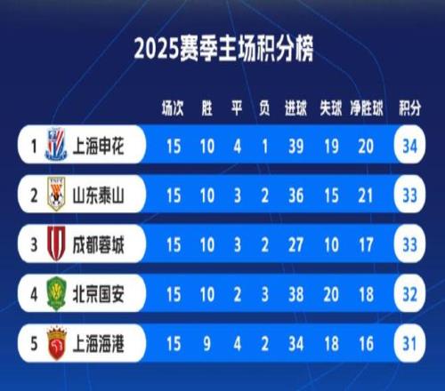 2025赛季中超主场积分前5: