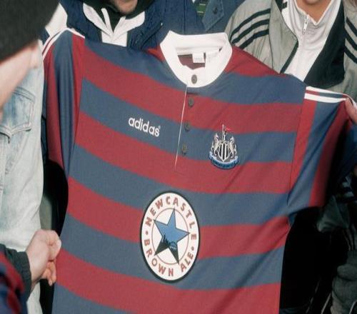 此次复刻的1995-96赛季客场球衣在设计上几乎完全还原了原版:酒红色与蓝色相间的粗横条纹极具辨识度,搭配米白色Polo翻领,胸前正中则是极具时代标志的圆形“Newcastle Brown Ale”标识,整体风格复古而张扬,充满90年代英伦足球的独特气质。