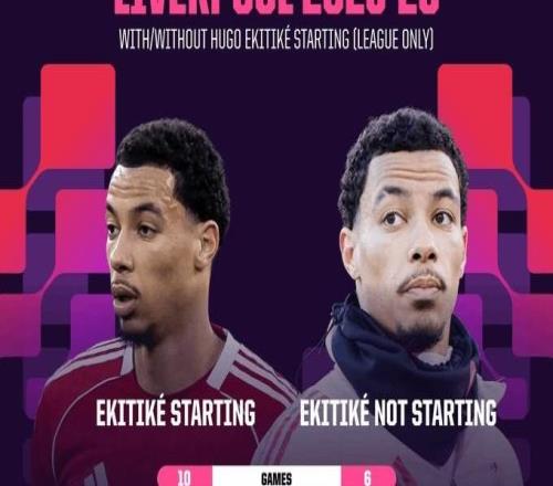 埃基蒂克本赛季英超首发时利物浦10战7胜,未首发时6战4负